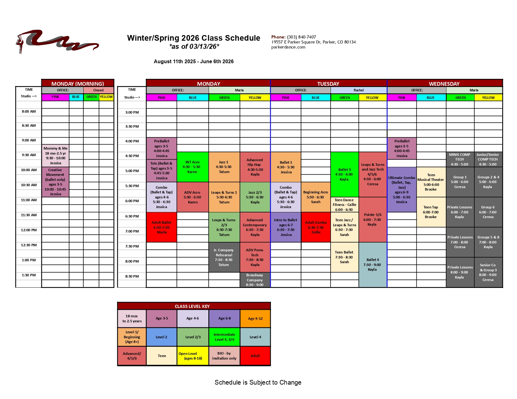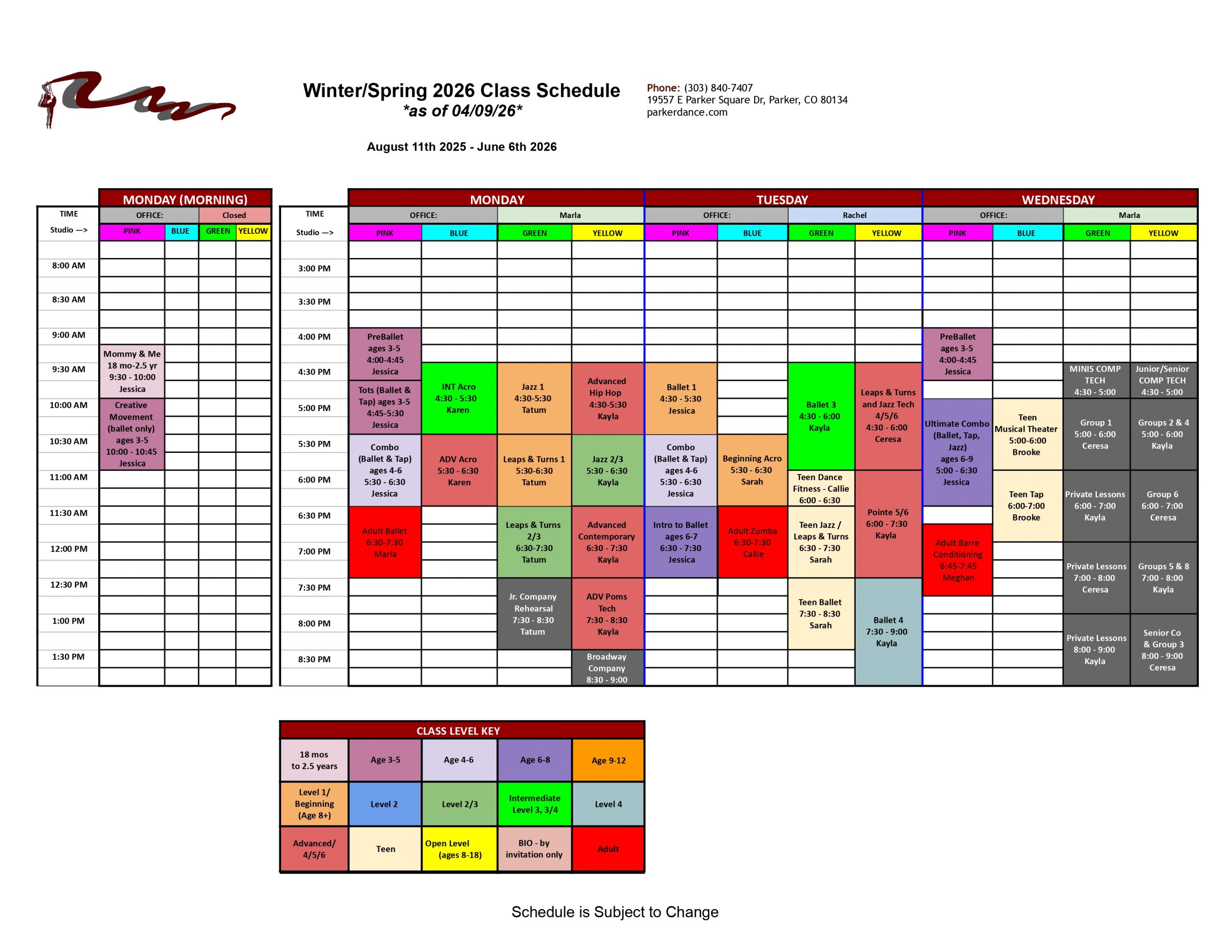 Find the classes for your dancer by their age as of September 30th. Classes run through mid June.